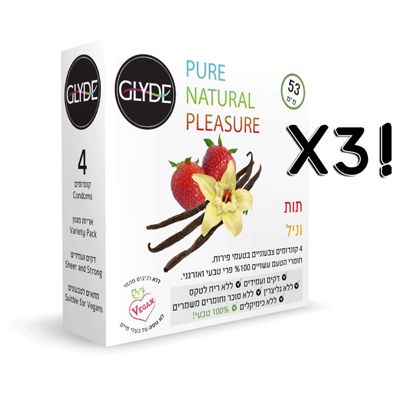 קונדומים בטעמים מסוג גלייד אולטרה (קונדום בגודל רגיל) צבעוניים, ועם טעמים וריחות העשויים מתמצית פירות אורגניים. החבילה מכילה 4 קונדומים בריח תות ווניל (שני קונדומים מכל סוג).